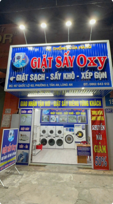 Hệ thống Giặt Sấy Oxy – Giải pháp giặt sấy hiện đại hàng đầu tại Long An, mang đến cho khách hàng trải nghiệm sạch – nhanh – an toàn – tiết kiệm thời gian.
